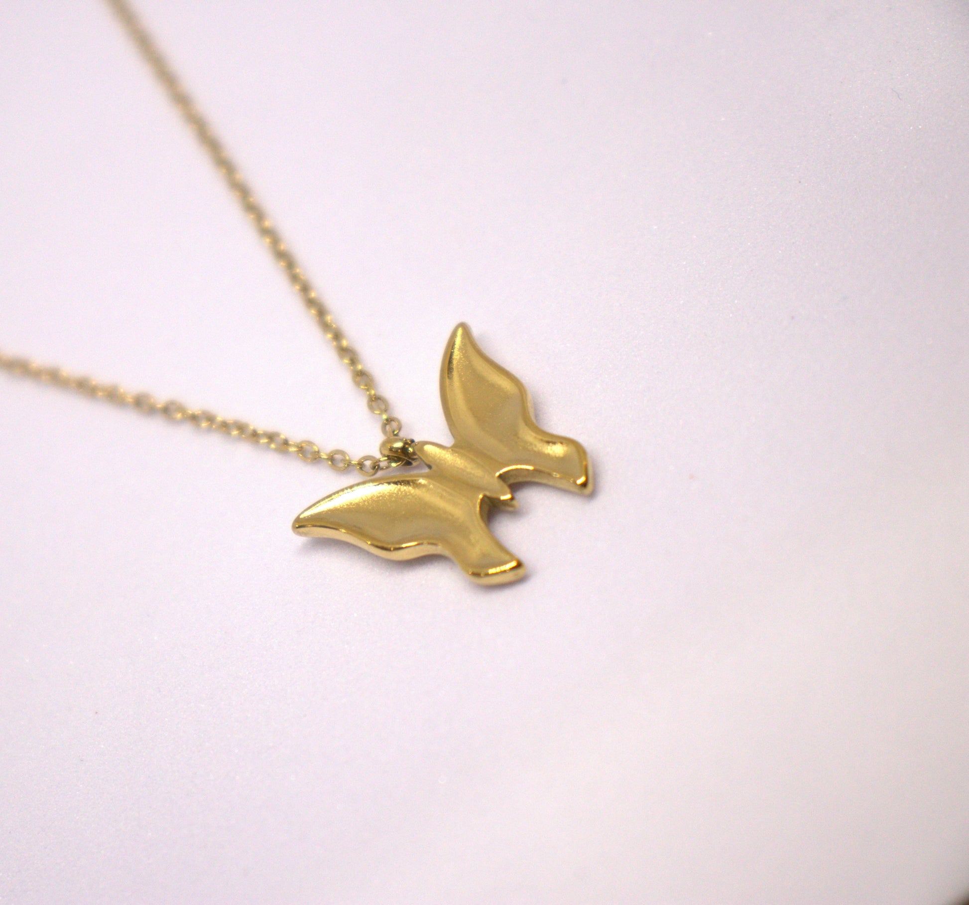 The pendant in the image is a gold-colored butterfly pendant on a matching chain.