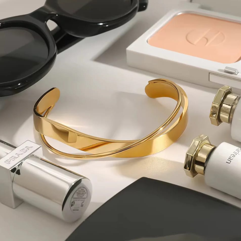 The product in the image is a gold-toned cuff bracelet, which appears to be the Prada Eternal Gold cuff bracelet.