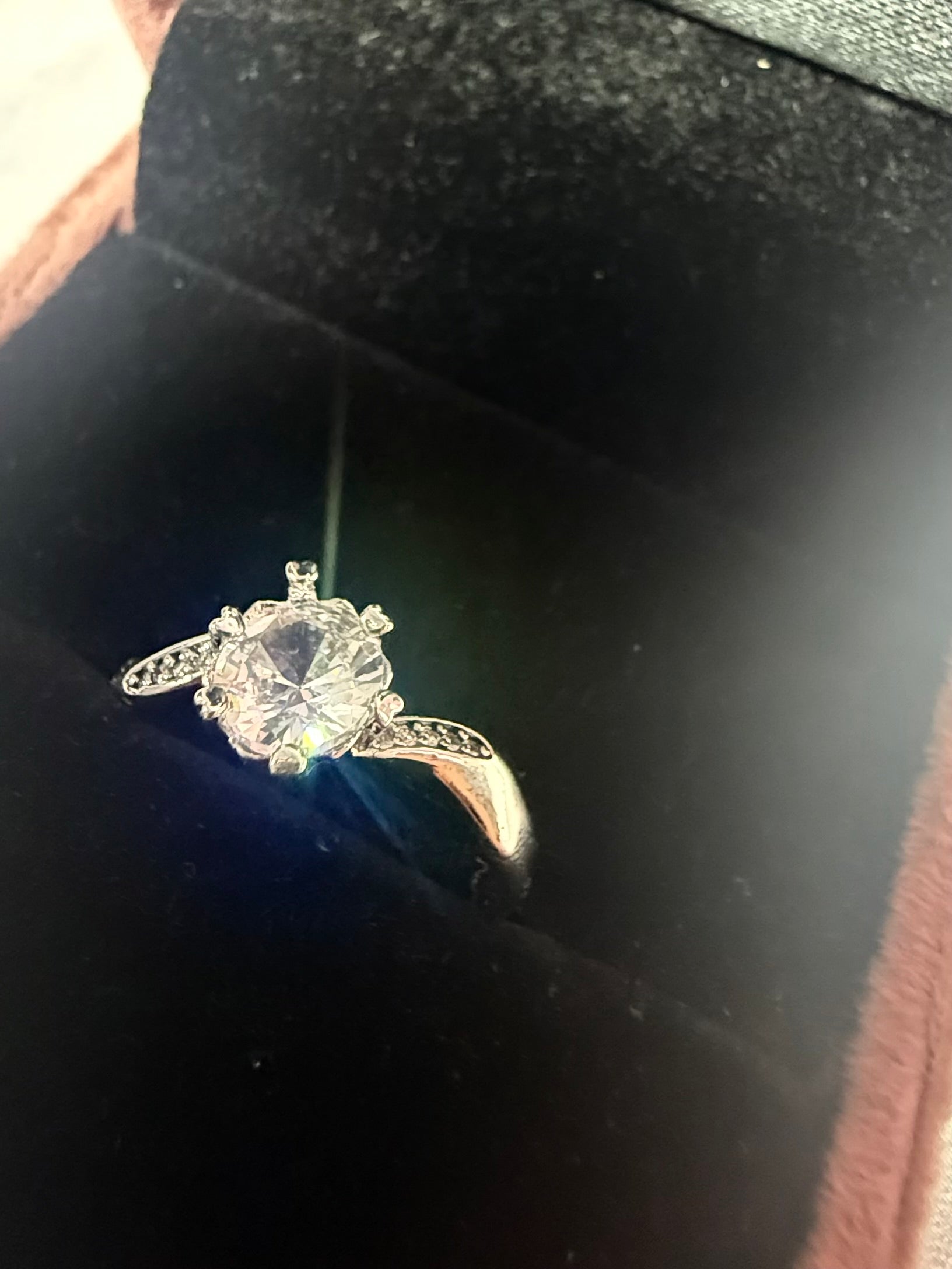 The image displays a silver-toned ring, possibly white gold or rhodium-plated, featuring a prominent central stone, likely a diamond or a diamond simulant like cubic zirconia or moissanite, set in a four-prong setting. The ring's shoulders are adorned with smaller, pave-set stones, adding to its sparkle. This design suggests it could be an engagement ring or a dress ring.