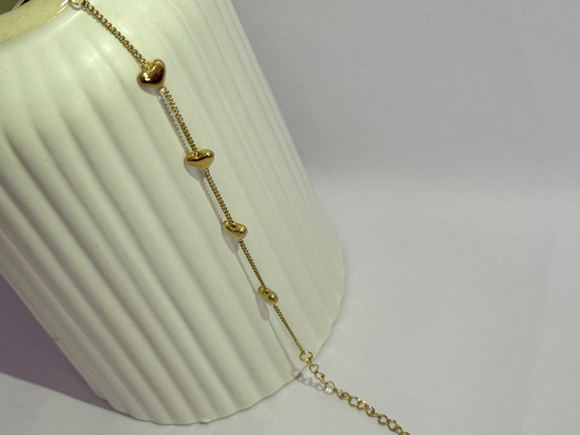 This is a gold-toned bracelet featuring a delicate chain with heart-shaped charms.